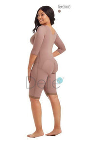 Girdle with incorporated bra, provides control to the arms and thighs. The clasps down the middle of the girdle allows for three different levels to control the abdomen region.