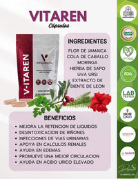 V-ITAREN es un suplemento que apoya a tu sistema renal a tener una purificación para su correcto funcionamiento. Uno de sus ingredientes más característicos, la cola de caballo, por sus beneficios naturales puede ayudar a disminuir la retención de líquidos, cálculos renales y de vejiga.