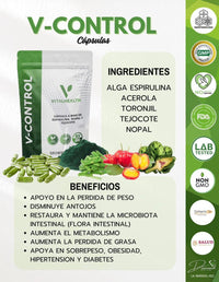 Fórmula Equilibrada: V-Control combina ingredientes clave para abordar la ansiedad por comer, respaldando la pérdida de peso y una alimentación equilibrada.